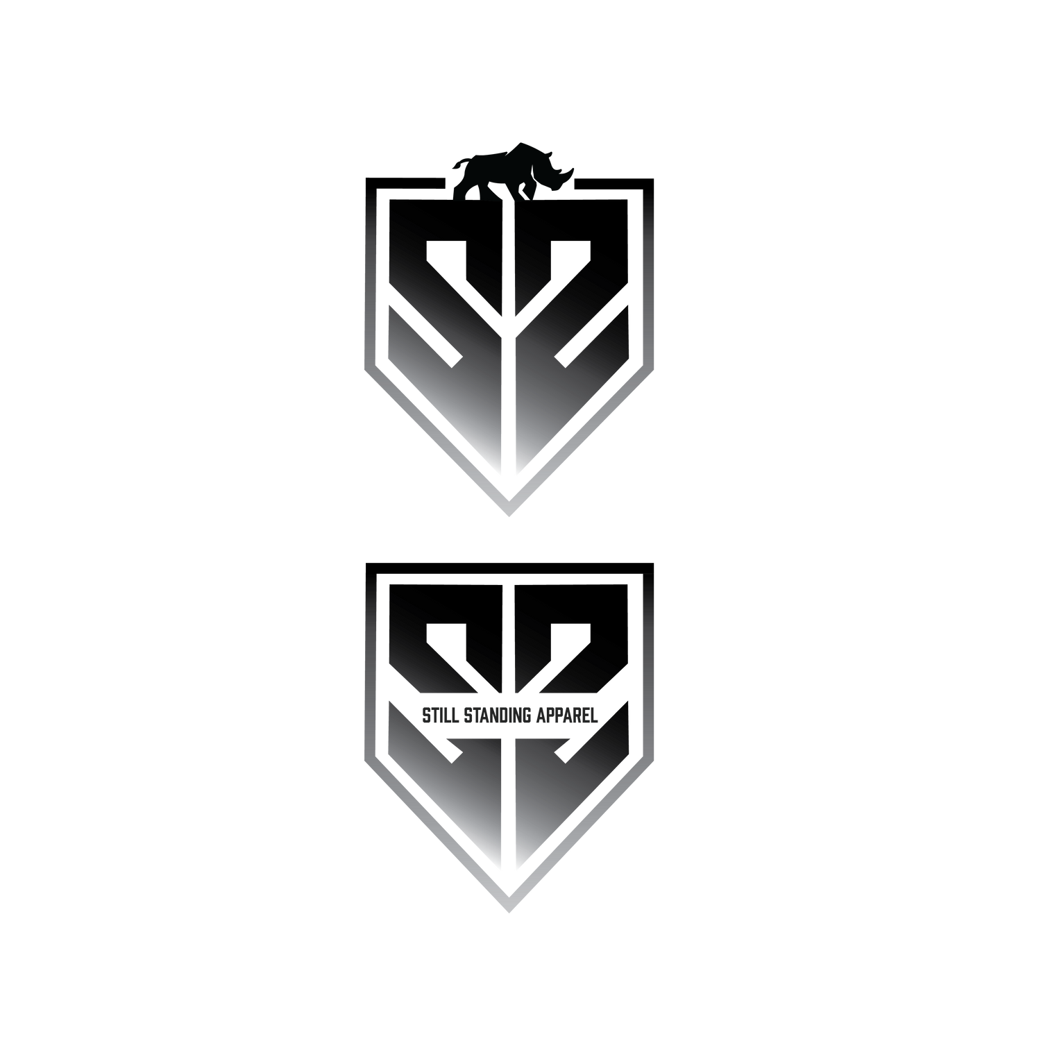 Designed by Emma Alexander, our lead visual designer, the primary logo showcases a monogram of two reflective S's to the name "Still Standing" in a minimalistic yet memorable geometric letter shape. The pentagon outline appears badge-like, an ode to those seen in the United States military. For a visual representation of the brand's core values: power, strength, and endurance, a rhino is used.